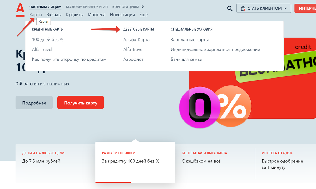 - Перейти на официальный сайт банка https://alfabank.ru/, выбрать вкладку «Карты», а затем «Дебетовые карты».