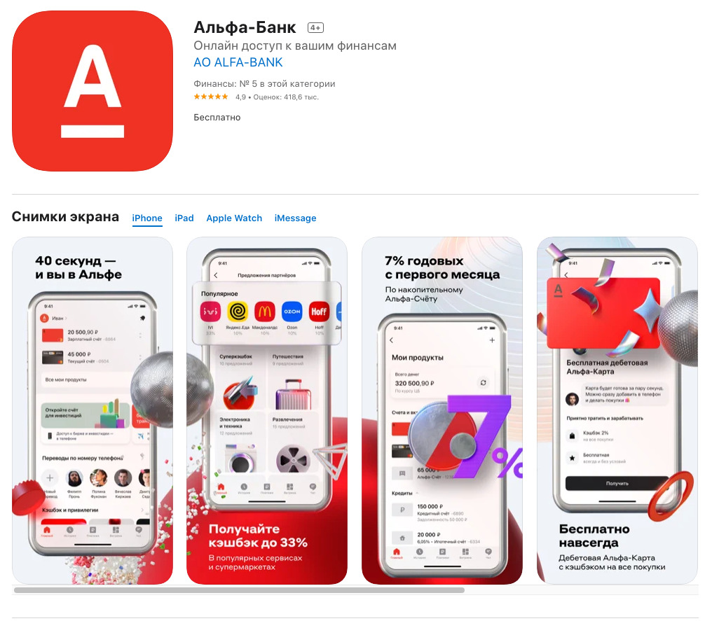 Для Айфонов приложение альфа-банка всегда в свободном доступе в App Store: