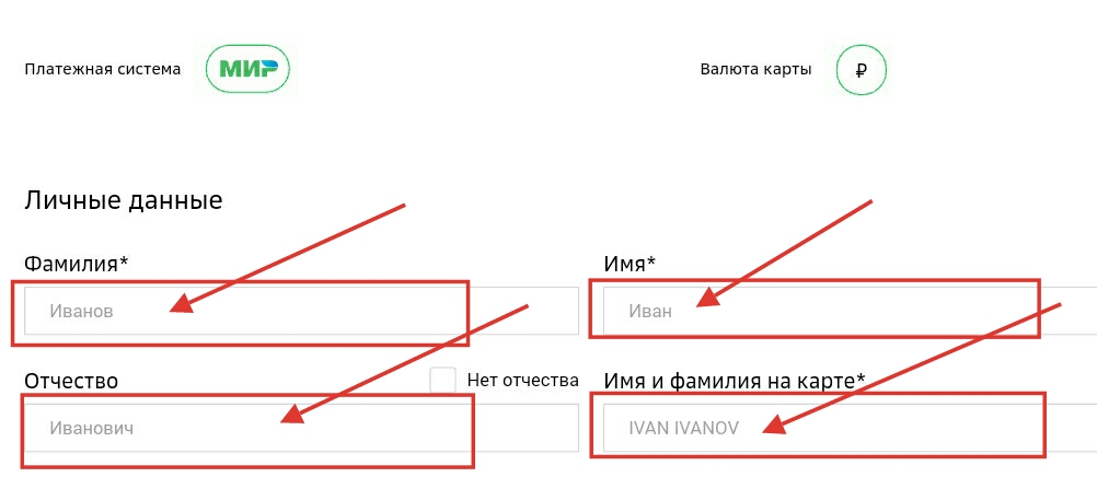 - Ввести фамилию, имя, отчество заявителя, а также имя и фамилию, которые будут указаны на карточке.
