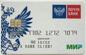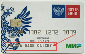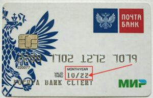 - Срок действия платежного инструмента, который предоставляет собой месяц и две последние цифры года. Располагается ниже номера карточки. В данном случае срок действия карты Почта Банка — октябрь 2022 года.