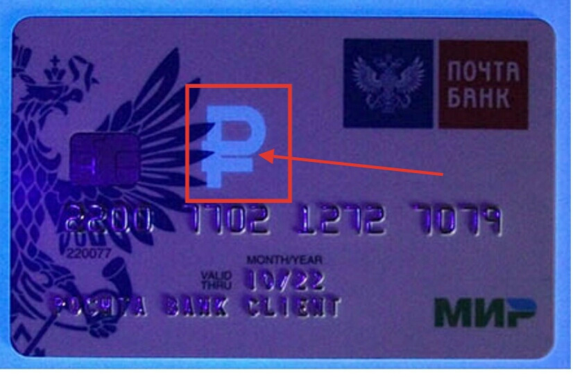 - Символ рубля, отличающий инструменты МИР от продуктов других платежных систем. При обычном рассмотрении карточки этот значок не виден. Обнаружить его можно с помощью ультрафиолетового луча.