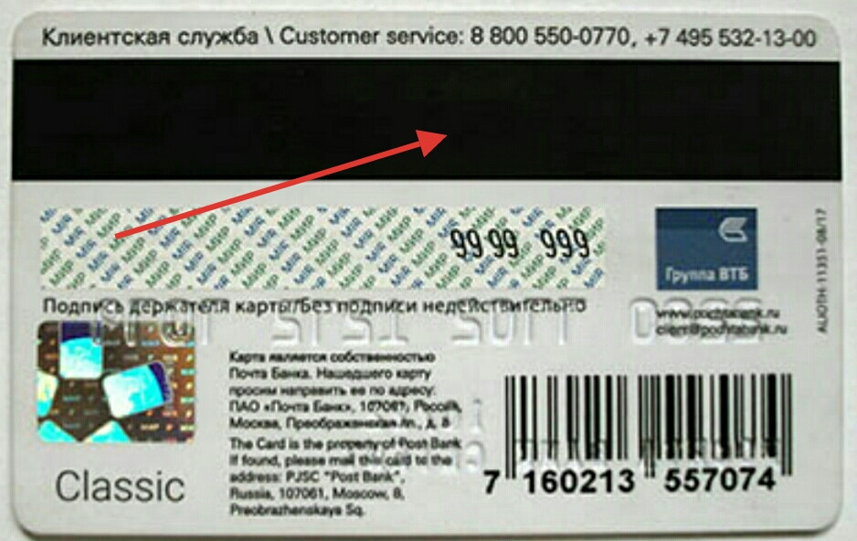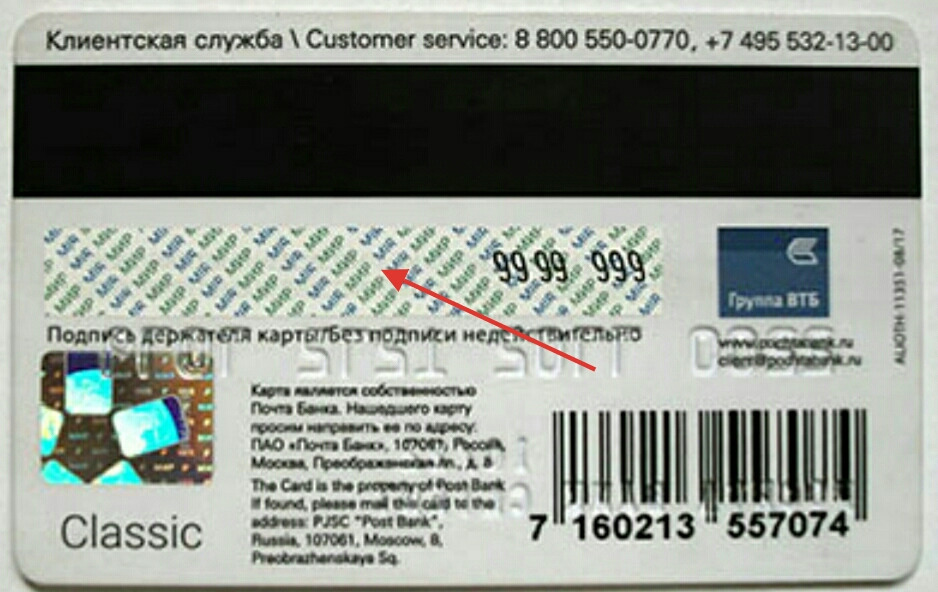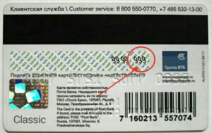 - Цифры, расположенные на белой полосе. Первые четыре из них — это последние цифры номера карточки, следующие три — код безопасности, обеспечивающий защиту платежам в интернете.
