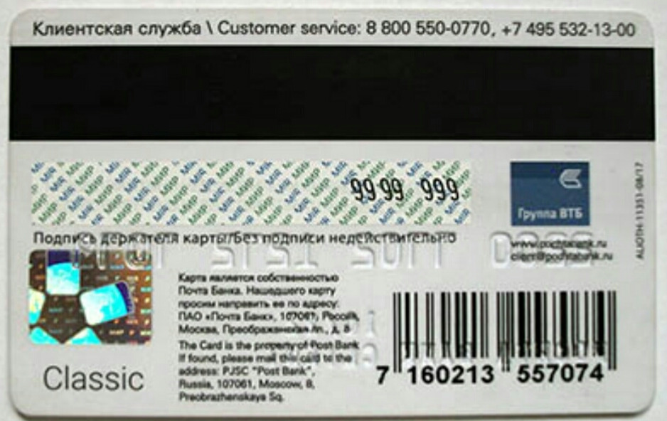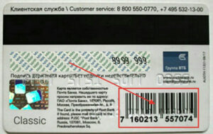 - Белая бумажная полоса для подписи держателя. Данный элемент защиты является дополнительным, а не обязательным. Располагается ниже магнитной полосы.
