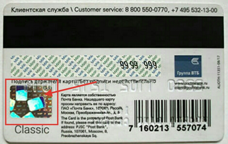 - Голограмма — элемент, который позволяет отличить банковскую карточку от подделок. Может размещаться как на лицевой, так и на оборотной стороне.