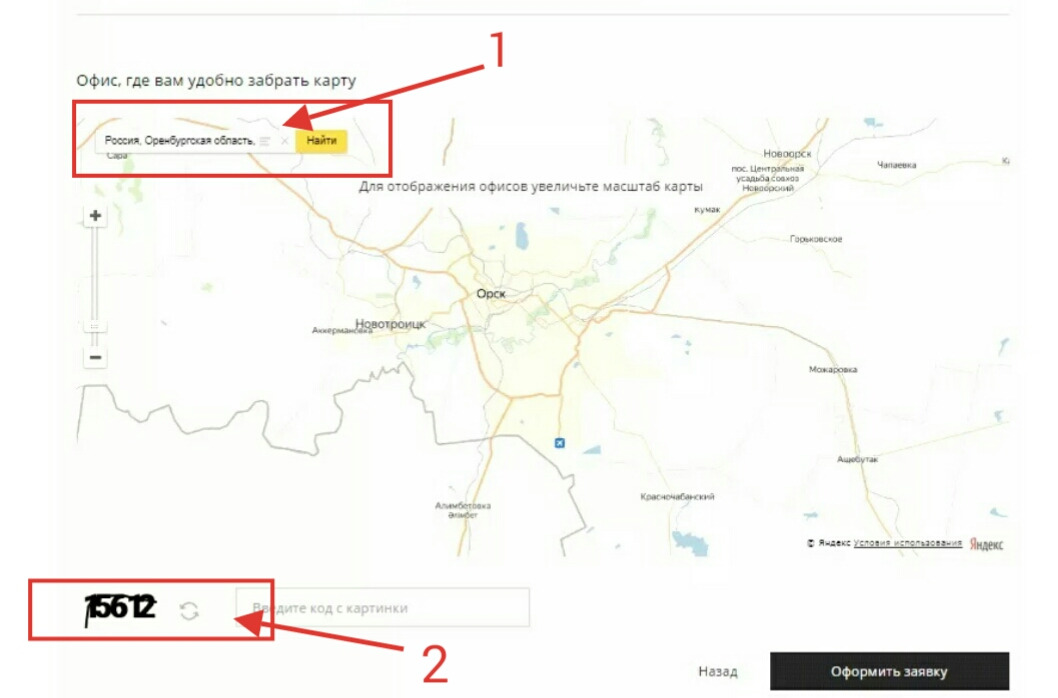 - Указать отделение банка, воспользовавшись строкой поиска (1), и ввести набор символов с картинки (2).