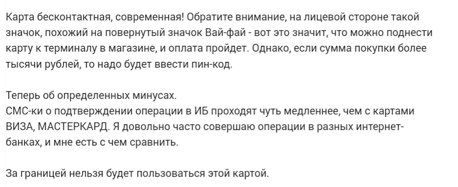 - Отсутствие доступа к платежам за рубежом, за исключением некоторых стран СНГ и мира. Но при этом существует возможность оформить кобейджинговую карточку МИР, которую можно использовать за пределами РФ.