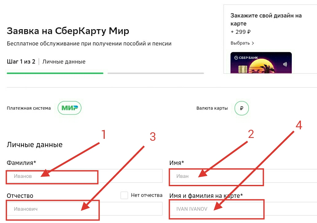 - Ввести личные данные заявителя: 1 — фамилию; 2 — имя; 3 — отчество; 4 — имя и фамилию, которые будут указаны на оборотной стороне карты.