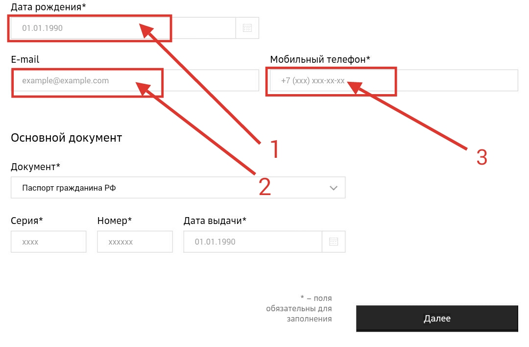 - Указать дату рождения заявителя (1) и контактные данные: 2 — адрес электронной почты; 3 — номер мобильного телефона.