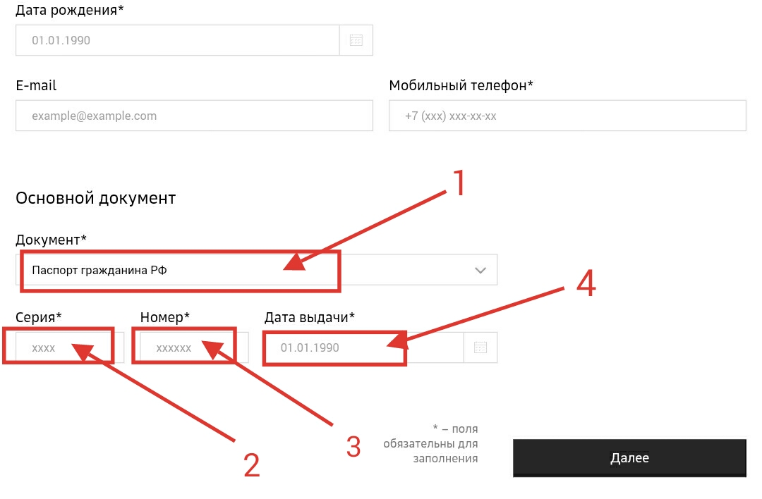 - Указать данные о документе, подтверждающем личность заявителя: 1 — наименование документа; 2 — серию; 3 — номер: 4 — дату выдачи.